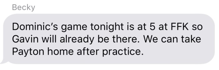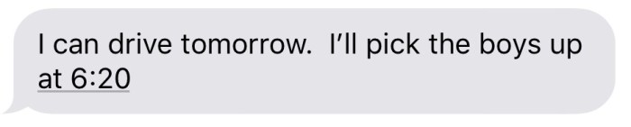 These texts mean that several of us parents are all helping each other out. Instead of having to each run kids ourselves were able to help each other out to drive kids in groups to all of the different events they have going on. How awesome that we’re all able to help each other out and cut our drive times and Uber responsibilities way down?