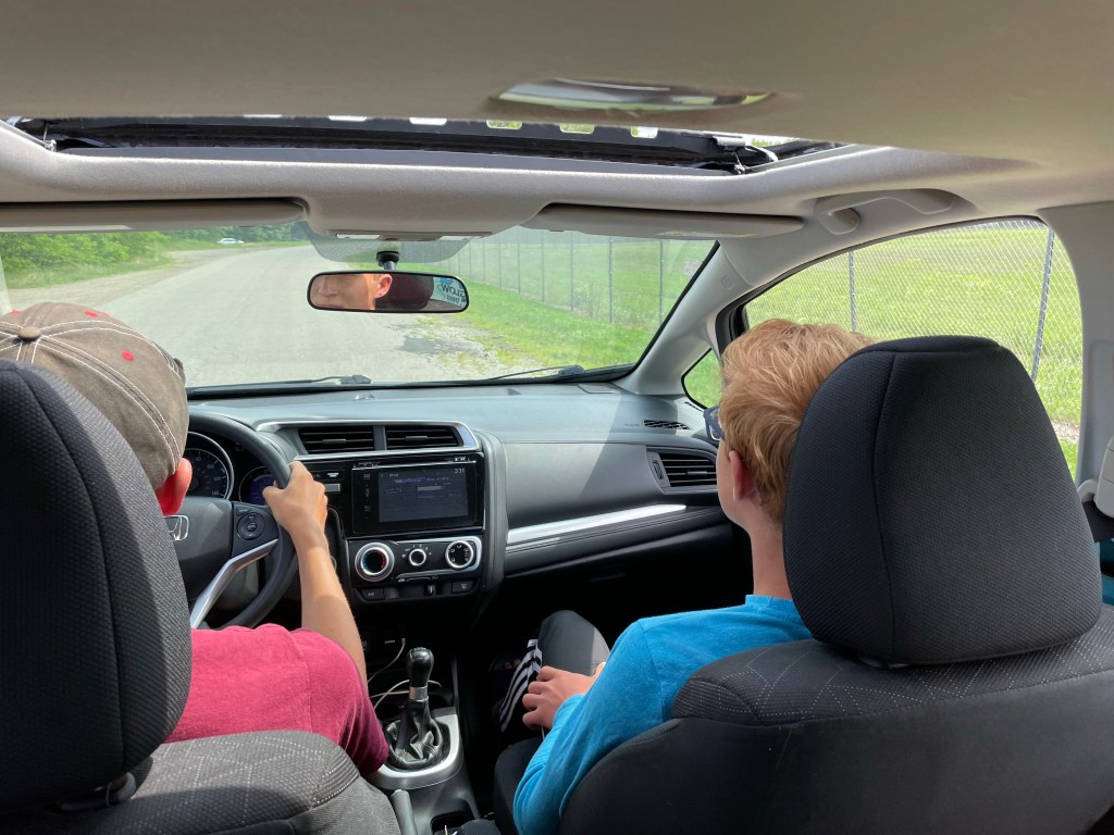 Yes, those are our boys in the front seats. Dominic is driving the used car we just picked up for the two of them to use through high school. On their first drive with it I moved to the backseat about halfway through so they could both get used to the seats they’ll be in often over the next few years.