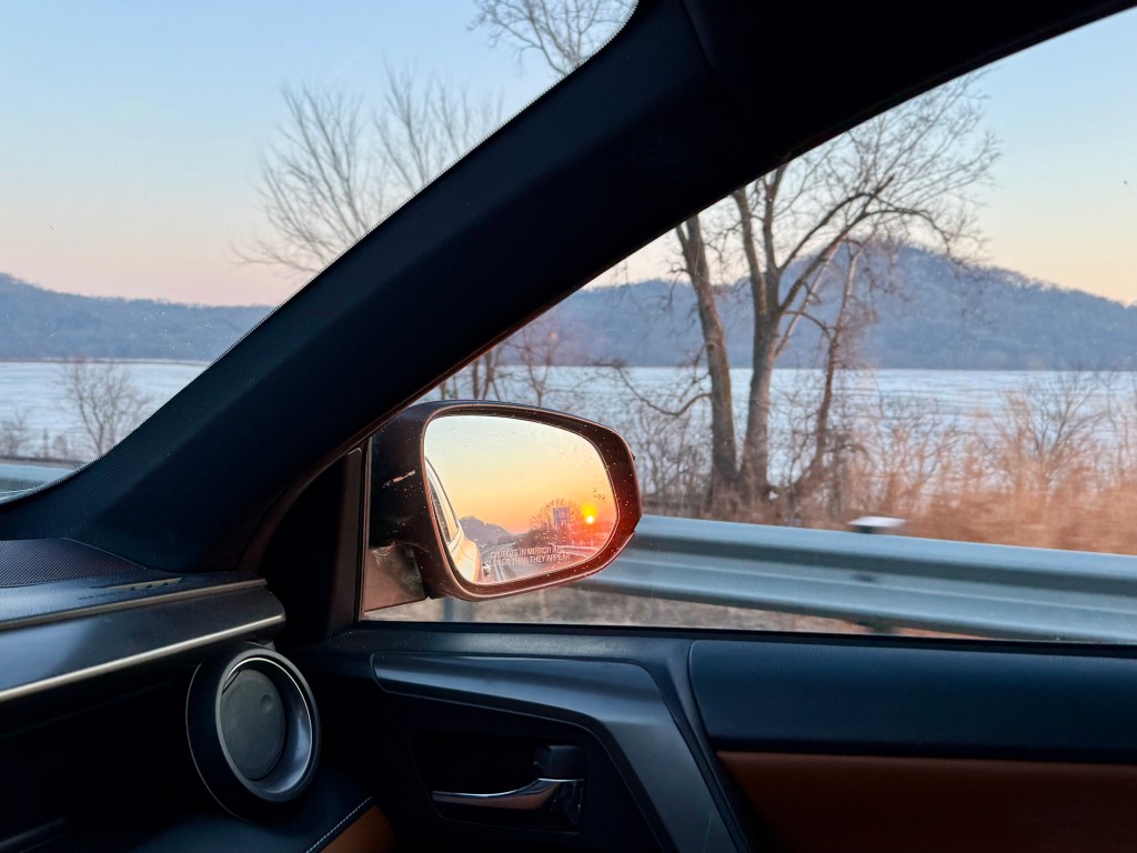 As if that wasn’t enough, the sunrise told the moonrise “hold my beer,” and proceeded to put up a stunner of its own! While it was at my back I was able to watch it slowly lift above the Mississippi River Valley and change the colors of the visible world. I was even able to sneak in a quick pic of it in the side view mirror.